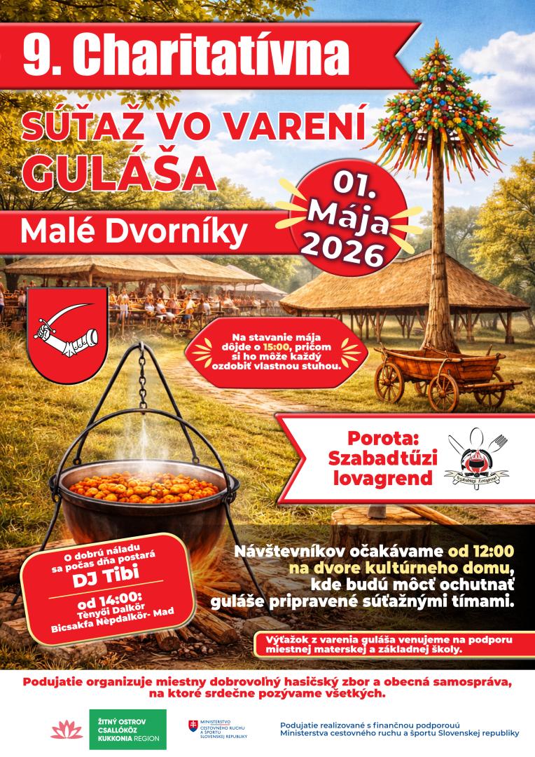 Oznamujeme občanom, že 01. mája 2026 piatok, na dvore obecného domu samospráva obce a dobrovoľný hasičský zbor obce organizuje IX. dobročinnú súťaž vo varení guláša. Návštevníkov na ochutnávanie už hotových gulášov čakáme od 12:00 hod. na dvore obecného domu. Ďalej o 15:00 hod. pri obecnom dome sa bude stavať máj. O dobrej nálade sa postará DJ Tibi. Na podujatie všetkých Vás srdečne očakávame.
